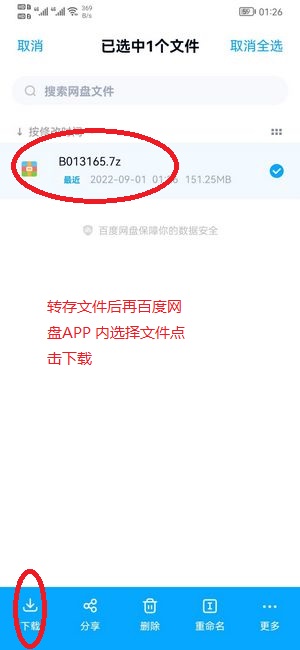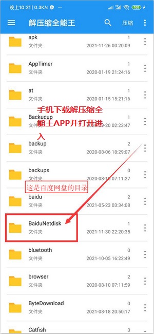 安卓端区别于苹果端的地方是资源转存到你自己的百度网盘后,先下载资源,下载完成后不用点击,打开解压缩全能王APP,找到百度网盘的目录,如下图